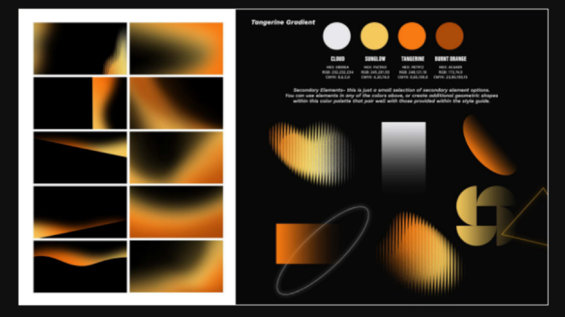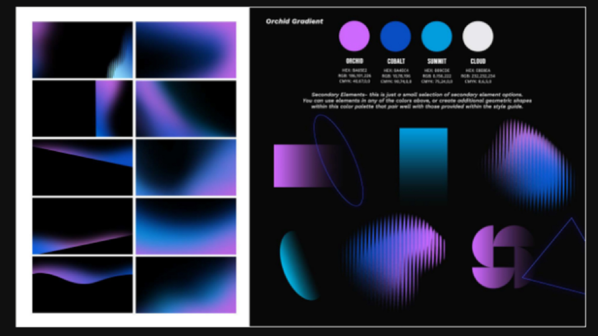 Los degradados de color pueden utilizarse como fondos completos o como formas individuales con degradado. La aplicación de un tratamiento de desplazamiento tipo “glass” en Photoshop sobre las formas degradadas crea una variedad de elementos únicos. Las siguientes imágenes muestran ejemplos específicos de degradados de color y formas combinadas con los colores vecinos de la paleta. Hemos proporcionado instrucciones para aplicar el tratamiento de desplazamiento en Photoshop, así como archivos PNG de todos los degradados de color y formas que se muestran en las siguientes páginas. Sin embargo, puedes crear elementos adicionales que complementen y se alineen con lo presentado en esta guía de estilo.