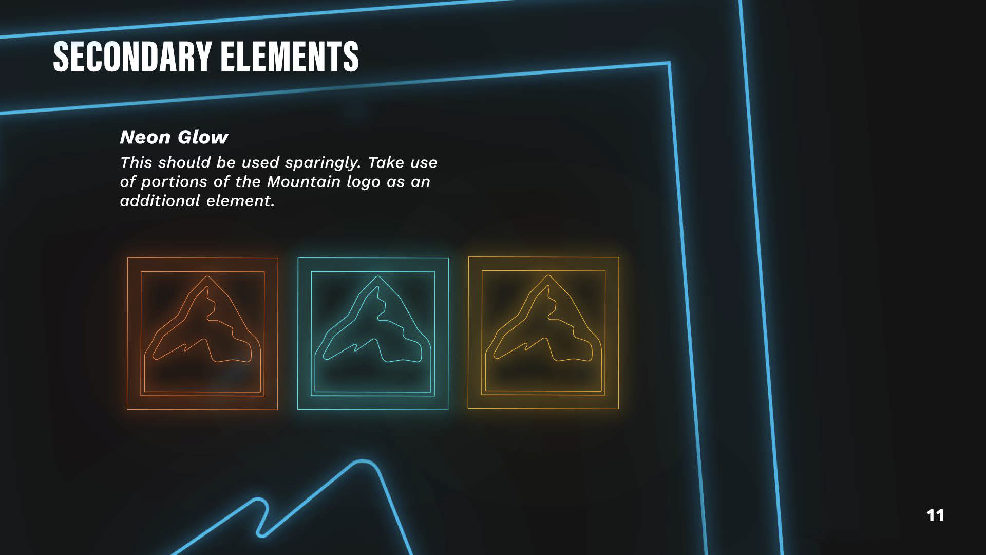 Puedes cargar el estilo de acción neón proporcionado en Photoshop para crear un efecto de resplandor neón. Este efecto debe utilizarse con moderación. Usa partes del logotipo de la montaña como elemento adicional. Hemos incluido archivos PNG del ícono de la montaña con efecto neón en una variedad de colores de la marca.