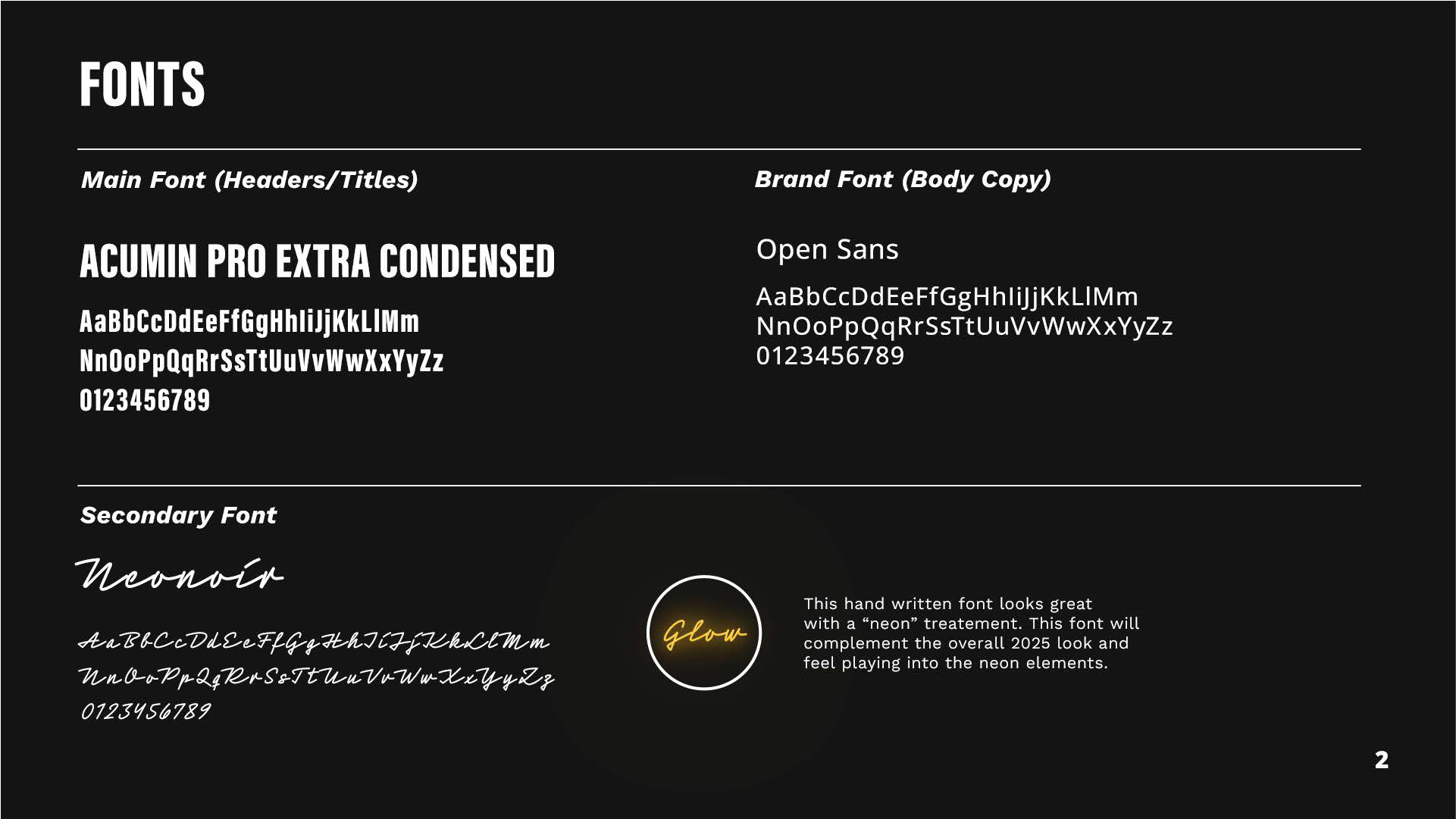 El arte principal de este año presenta el logotipo de GLS con el ícono de la montaña relleno con degradado y tratado con efecto neón. La tipografía del logotipo en esta pieza es distinta de los logotipos oficiales de la marca. Este arte principal es una excepción a las normas de identidad visual presentadas en esta y las siguientes páginas.